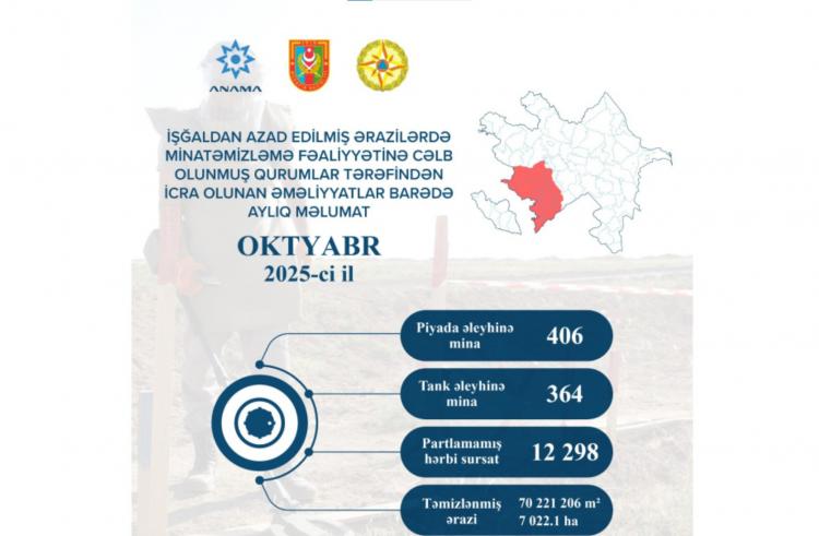 Azad olunan ərazilərdə oktyabr ayında 364 tank əleyhinə mina, 406 piyada əleyhinə mina, 12 298 partlamamış hərbi sursa aşkarlanıb və zərərsizləşdirilib. ANAMA azad edilmiş ərazilərdə həyata keçirilən humanitar minatəmizləmə əməliyyatları ilə bağlı aylıq məlumatı yayıb.