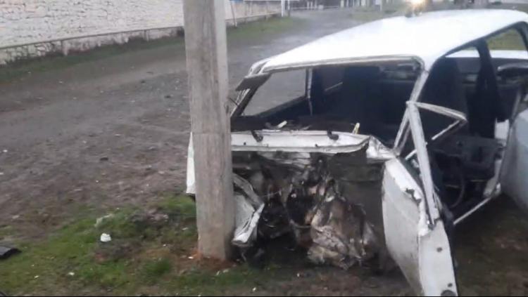 Oğuzda işıq dirəyinə çırpılan avtomobil hissələrə parçalanıb