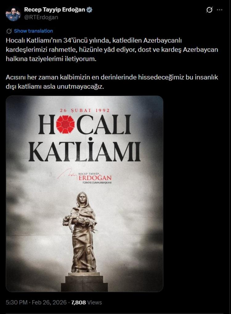Türkiyə Prezidenti Rəcəb Tayyib Ərdoğan Xocalı soyqırımının 34-cü ildönümü ilə bağlı paylaşım edib."Xocalı qətliamının 34-cü ildönümündə qətlə yetirilən azərbaycanlı qardaş-bacılarımızı rəhmət və dərin hüznlə yad edir, dost və qardaş Azərbaycan xalqına başsağlığı verirəm.Ağrısını hər zaman qəlbimizin ən dərinində hiss edəcəyimiz bu insanlıqdan uzaq qətliamı heç vaxt unutmayacağıq", - paylaşımda qeyd olunub. Türkiyənin xarici işlər naziri Hakan Fidan da Xocalı faciəsinin 34-cü ildönümü ilə bağlı paylaşım edib. "Xocalı qətliamının 34-cü ildönümündə həyatını itirən azərbaycanlı qardaş-bacılarımızı rəhmətlə yad edirəm. Qardaş Azərbaycanın ağrısını qəlbimizin ən dərin yerində hiss edirik.Türkiyə "tək millət, iki dövlət" anlayışı ilə hər zaman Can Azərbaycanın yanındadır" - paylaşılıb.