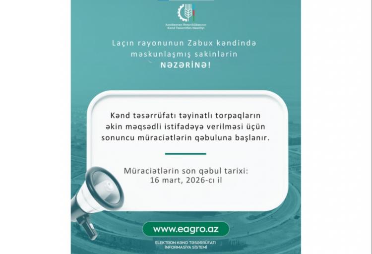 Laçın rayonunun Zabux kəndində əkin məqsədli torpaqların istifadəyə verilməsi üçün son müraciətlərin qəbuluna başlanır.Kənd Təsərrüfatı Nazirliyindən verilən məlumata görə, kənddə məskunlaşan sakinlərin müraciətləri martın 16-sı günün sonuna qədər qəbul olunacaq.Torpaq sahələri minimum 5 hektar olmaqla dəmyə ərazilərdən ibarətdir və bu sahələrdə buğda, arpa, noxud, kartof və yem bitkilərinin əkilməsi nəzərdə tutulur.Müraciət edənlərlə müqavilələrin imzalanması və təlimlərin keçirilməsi isə bu ilin oktyabr-noyabr aylarında planlaşdırılır.